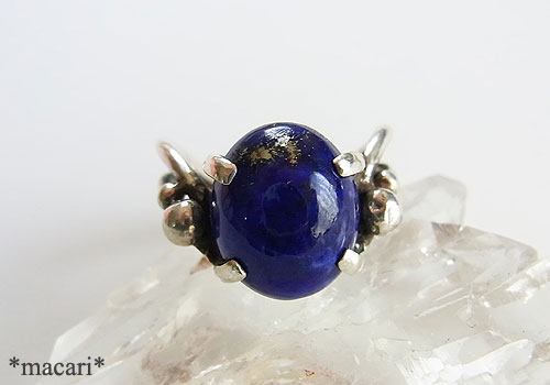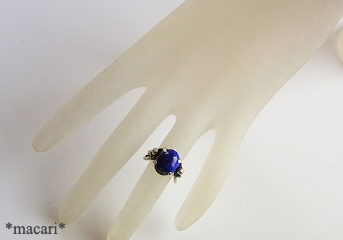 群青色のラピスラズリにパイライトの輝きが綺麗なルースをシンプルな丸線2重のアームに飾りつけたリングです。