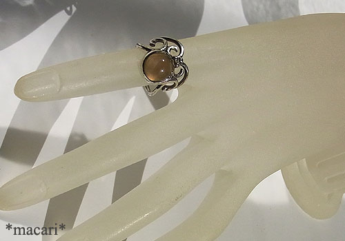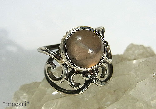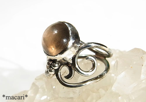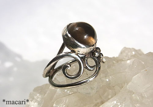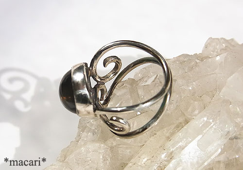 キャッツアイが浮かぶスモーキークォーツを唐草デザインのリングに仕上げました。落ち着いたカラーが魅力的なリングです。