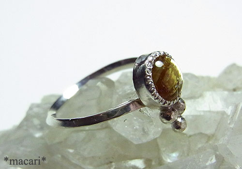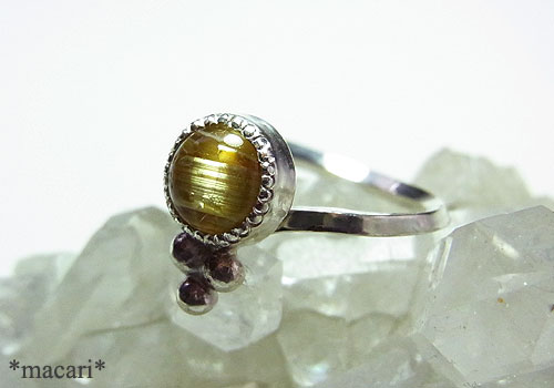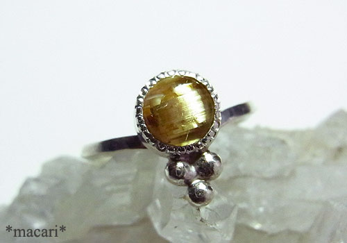 小粒のルチルクォーツを角線を使ったシンプルなリングに仕上げました。ルチル(金紅石)が束状に内包されているので、光の当たり具合で、キャッツアイが浮かび上がります。