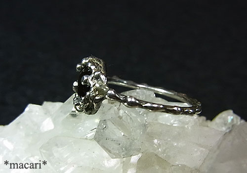 有機的なテクスチャの華奢なリングに小粒のブラックスターサファイアを留めてみました。