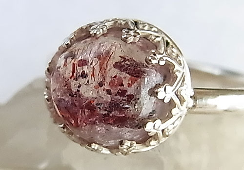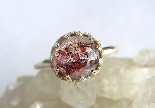 赤いレピドクロサイト(鱗鉄鋼)やゲーサイト(針鉄鋼)を内包した水晶のカボションを飾り枠でシンプルなリングに仕上げました。光に当たると内包物がきらきらと輝き綺麗です。^^