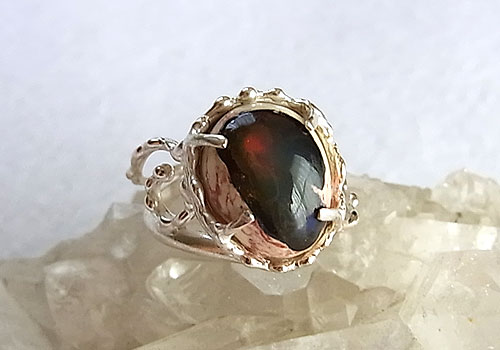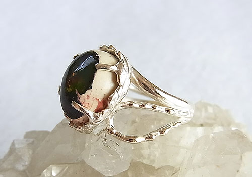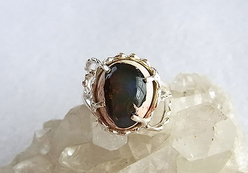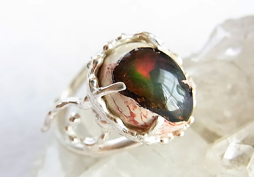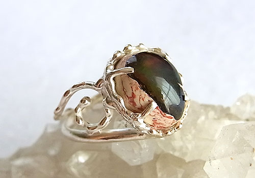 クリーム色の母岩に赤や緑、青の遊色が浮かぶカンテラオパールを粒々をあしらった唐草飾りのリングに仕上げました。オパール部分の背面は黒っぽいのですが、オパールの部分はやや乳白色なので、キラキラした遊色ではありませんが、ふんわりとした優しい輝きを浮かべます。