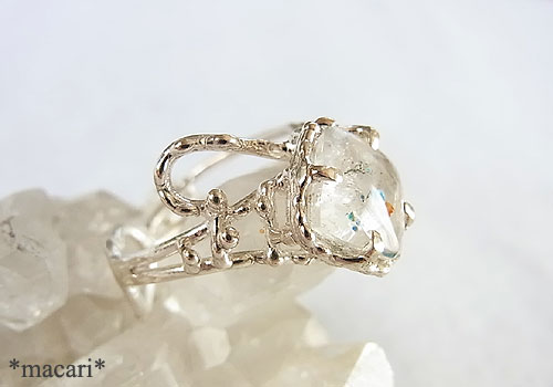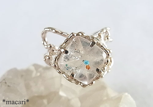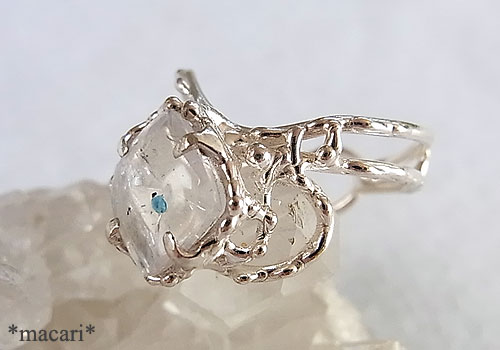 ミントブルーのコロンとしたジラライト(銅の珪酸塩鉱物)を内包した水晶をちょっと個性的なデザインのリングに仕上げました。
