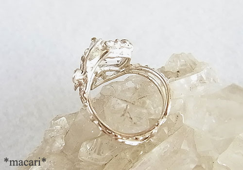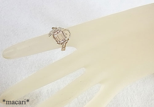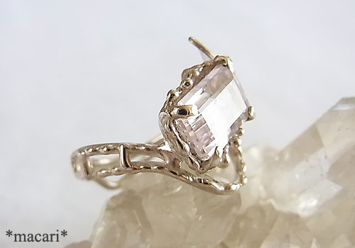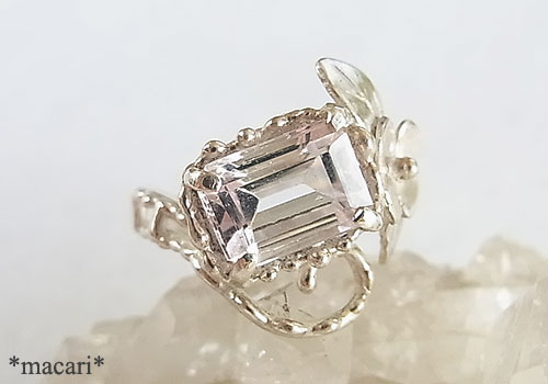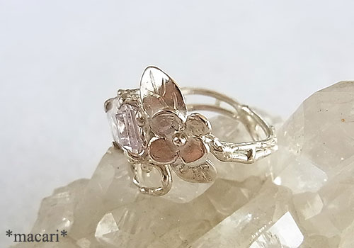 淡いピンクのクンツァイトに小さなお花をあしらった個性的デザインのリングです。かなり色が薄いクンツァイトなので、多色性も手伝って角度によってカラーレスに見えたりします。