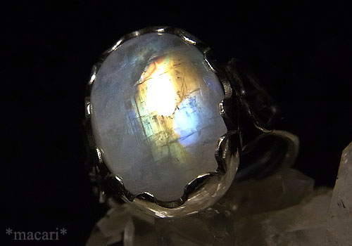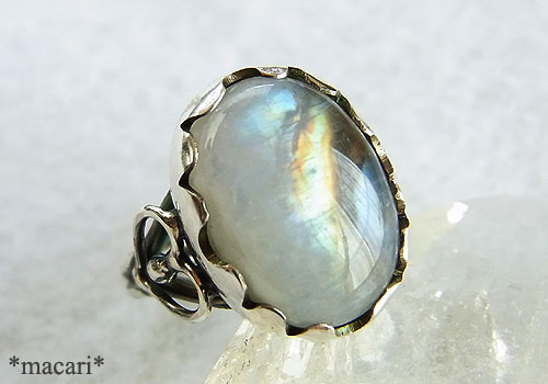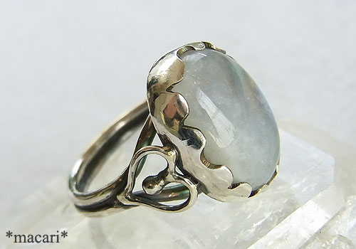 イエローやブルーの光が浮かぶホワイトラブラドライトをサイドにハートをあしらったリングに仕上げました。