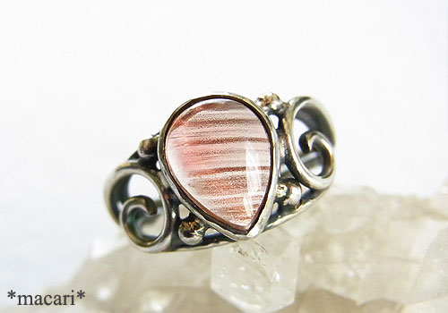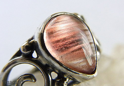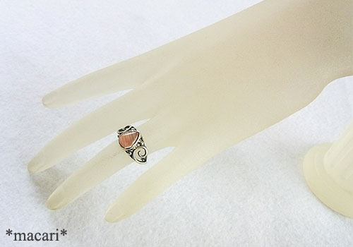 筋状に内包した微細な銅の欠片が、光に当たるとアプリコットのような優しいピンクオレンジに輝く、オレゴンサンストーンを唐草デザインのリングに仕上げました。現在掲載している他のオレゴンサンストーンリングより高品質なため、お値段が少し高くなっています。
