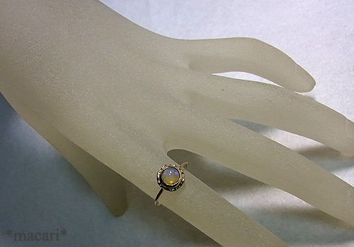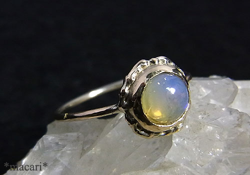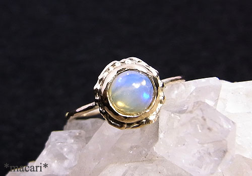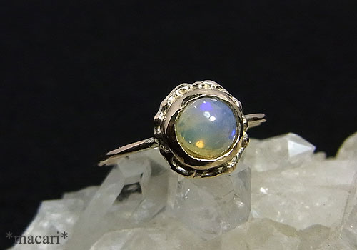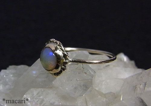 ブルーやグリーンの遊色が綺麗な小粒のエチオピアオパールをk10イエローゴールドでリングに仕上げました。少し内包物や小さなクラックが見られますが、透明感があり綺麗です。
