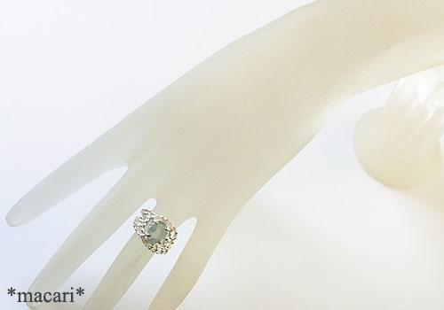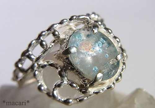 ミントブルーのジラライト(銅の珪酸塩鉱物)を内包した水晶を粒飾りのリングに仕上げました。
