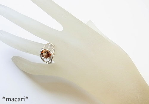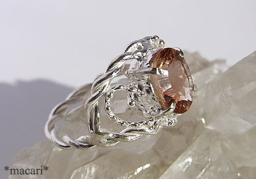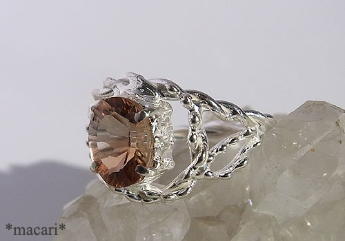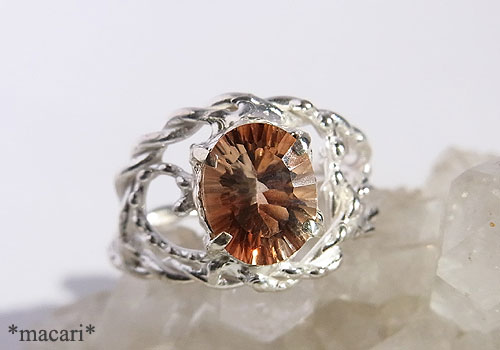 細かなカットを施されたトパーズをロープデザインのリングに仕上げました。色むらのあるトパーズですが、輝きの美しい石です。