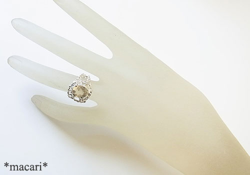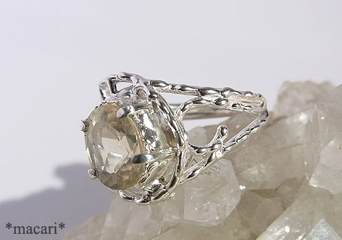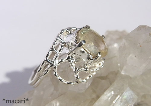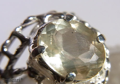淡いイエローの優しげな輝きが美しいラブラドライトを粒飾りのリングに仕上げました。もう少し色が濃く透明感のあるものはゴールデンラブラドライトとして流通していますが、鉱物的には同じ長石グループのバイトウナイト(亜灰長石)という石のようです。一応、購入した時の名前で掲載してみました。