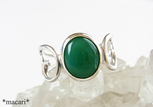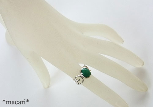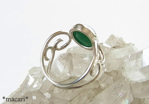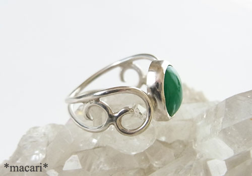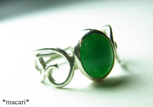 濃いグリーンのジェムシリカを華奢なタイプの唐草リングに仕上げました。