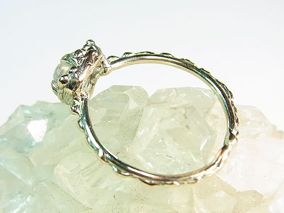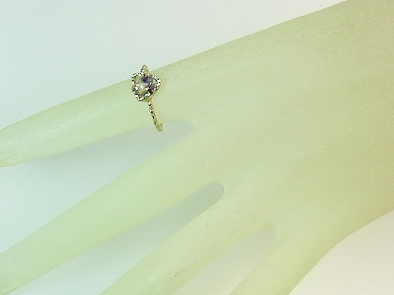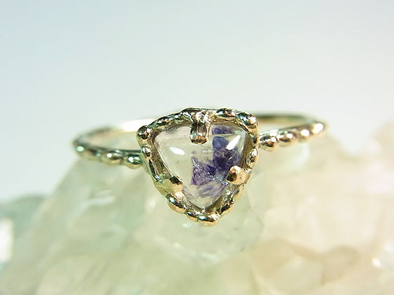 紫色のフローライト(蛍石)を内包した希少な水晶をk10イエローゴールドで細身のリングに仕上げました。 透明度の高い水晶なので、内包されているフローライトの形や色がハッキリと見られます。 控えめな金の輝きと小粒の石がとっても可愛らしいリングです。