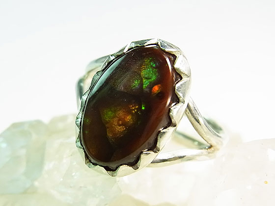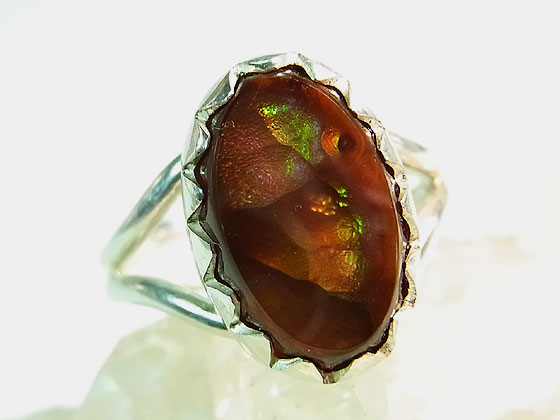 イリデッセンス(虹彩)が浮かぶ希少なファイアーアゲートをシンプルなシルバーリングに仕上げました。