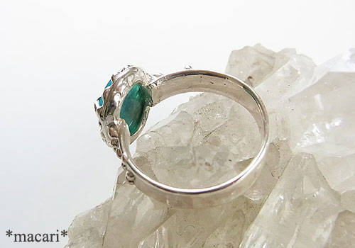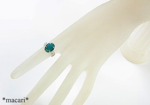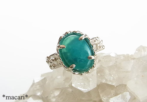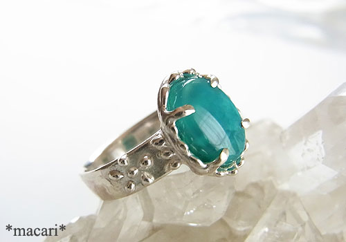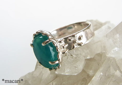 鮮やかなグリーンのジェムシリカのルースを粒飾りの可愛らしいリングに仕上げました。
