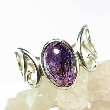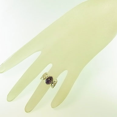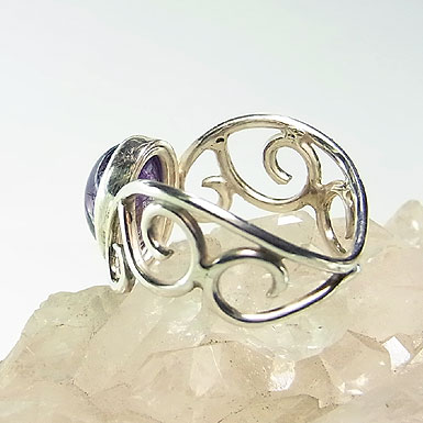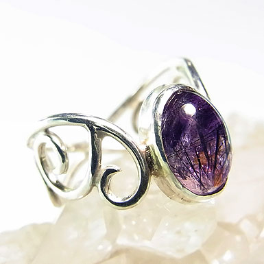 ゲーサイト(針鉄鉱)やレピドクロサイト(鱗鉄鉱)などを内包したアメシストを唐草デザインのリングに仕上げました。華やかさには欠けますが、内包物の入り方が面白い石です。