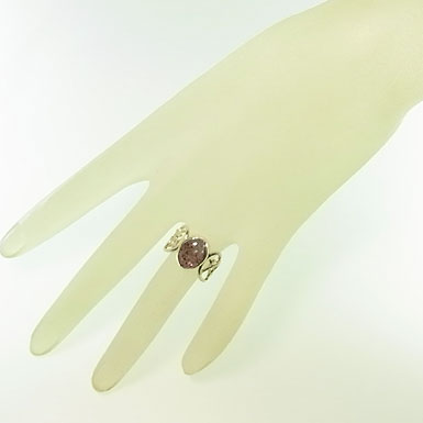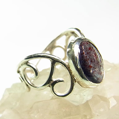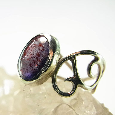 アイオライトにヘマタイト(赤鉄鉱)を内包したアイオライトサンストーンを唐草デザインのリングに仕上げました。