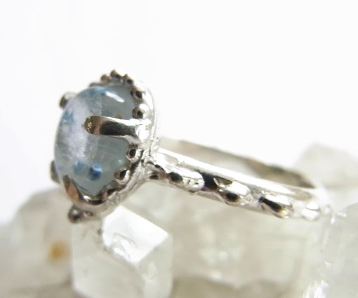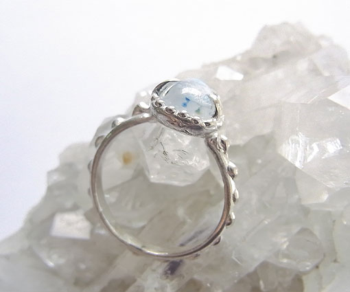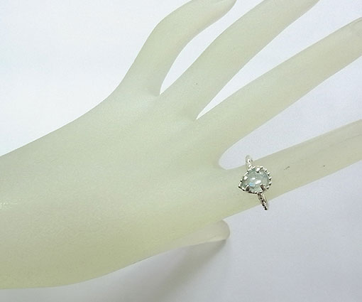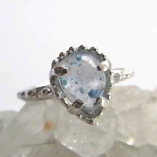 ミントブルーのジラライト(銅の珪酸塩鉱物)を内包した水晶を シンプルな粒飾りのリングに仕上げました。 ブラジルのパライバ州で産出することから「パライバクォーツ」とも呼ばれています。 爽やかなブルーと銀の輝きがマッチした品のあるリングです。