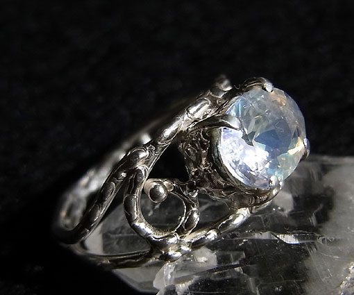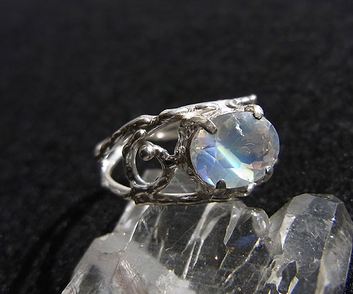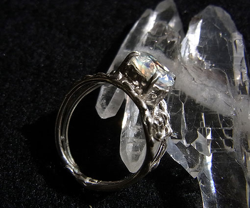 多彩な輝きを浮かべる美しいレインボーアンデシンをアシンメトリーな唐草リングに仕上げました。 レインボーアンデシンは、アノーサイト(灰長石)とアルバイト(曹長石)の中間に位置する 斜長石グループの鉱物です。