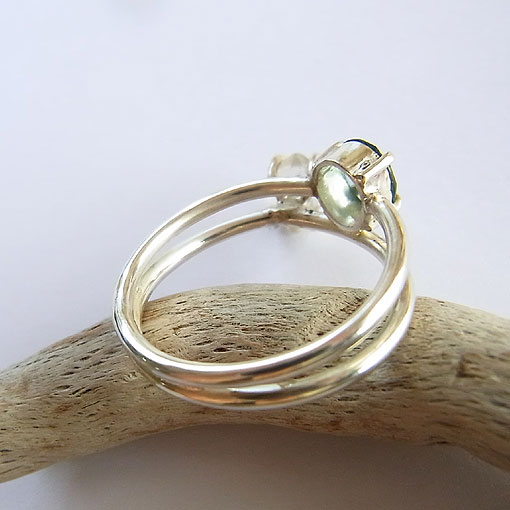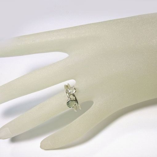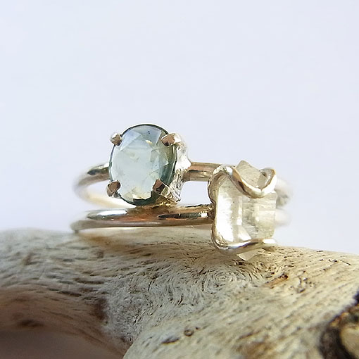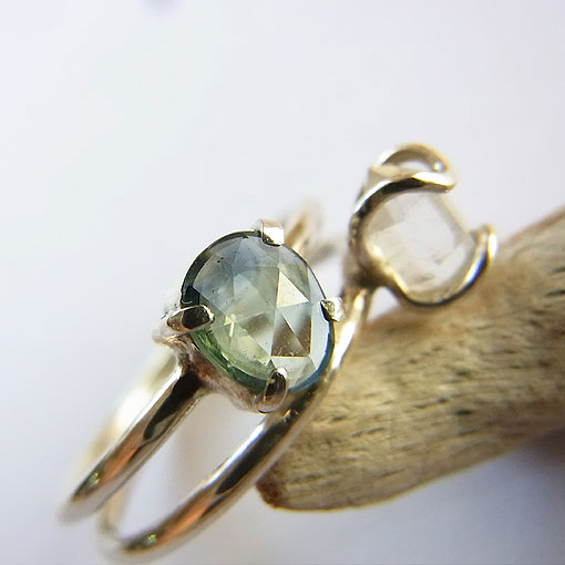 ローズカットを施されたサファイアと小さなチベット水晶を2連風のリングに仕上げました。淡いグリーンの綺麗なサファイアですが、色むらがあるので角度によって色の濃さが違って見えるようです。光に当たるとカット面がキラキラと輝き綺麗です。水晶は透明感はありませんが、形状の綺麗なものを選んでみました。