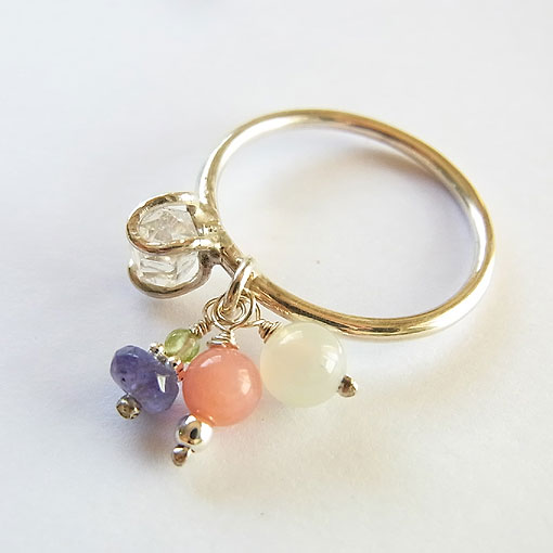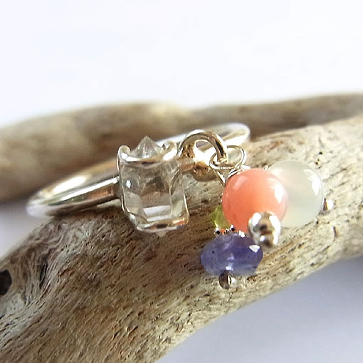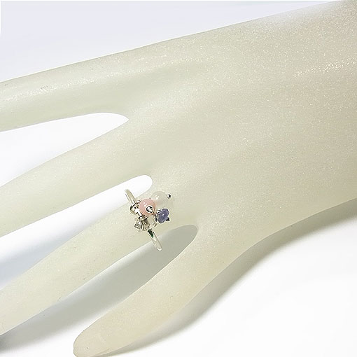 小さな両剣のチベット水晶にタンザナイト、ピンクオパール、ムーンストーンのビーズを飾り付けた華奢な雰囲気のリングです。