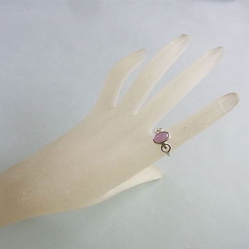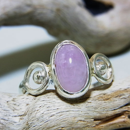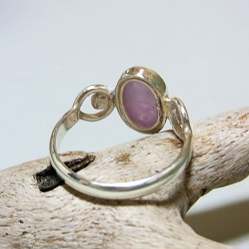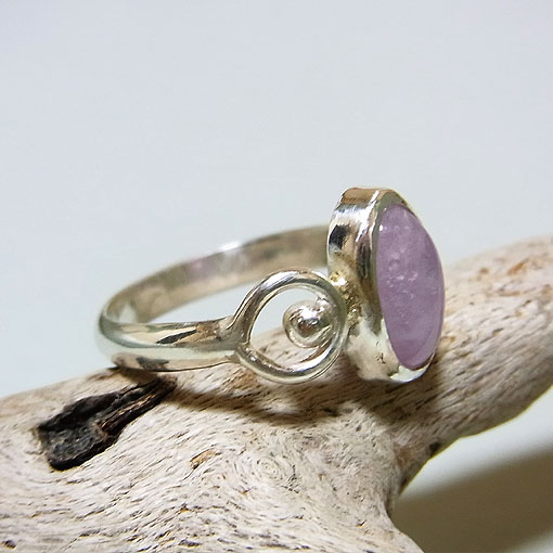 ソーダライトの変種で、日光に当てると濃い紫色に変化するハックマナイトという石を 両端に丸みつけたデザインのシルバーリングに仕上げました。