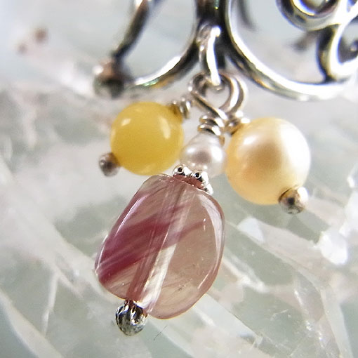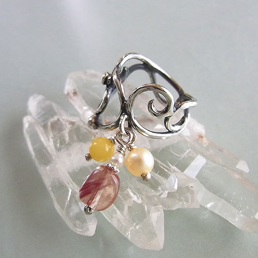 唐草デザインの小指用リングに、アンデシン、淡水パール、ミルキーアンバーを飾り付け、少し個性的な印象に仕上げてみました。