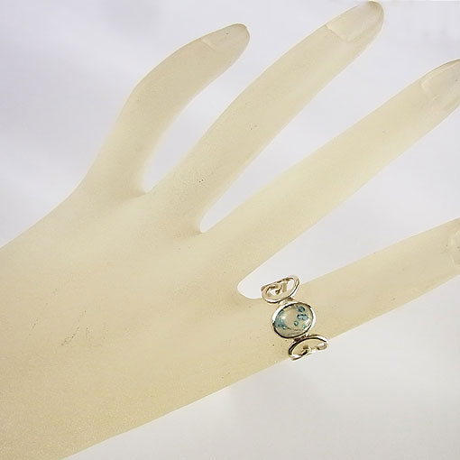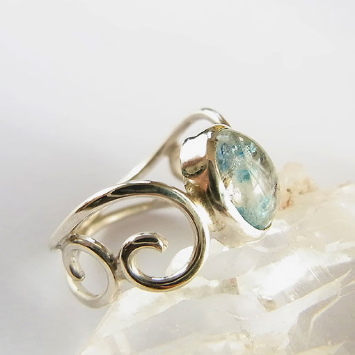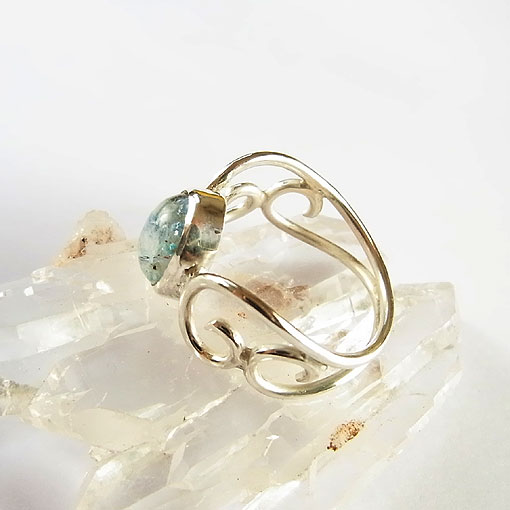 コロンとしたジラライトを内包した水晶を当店定番の唐草リングに仕上げました。