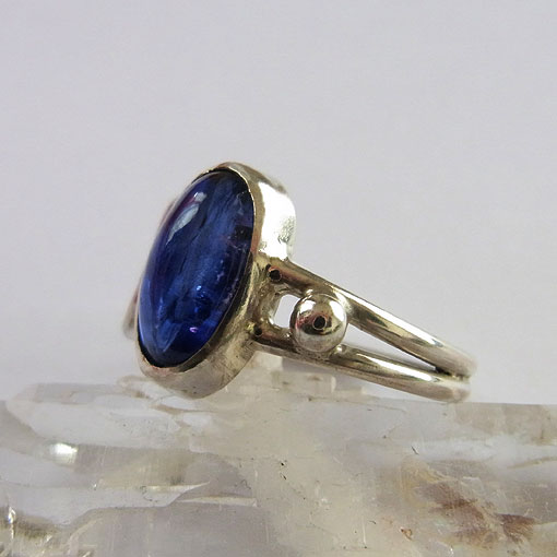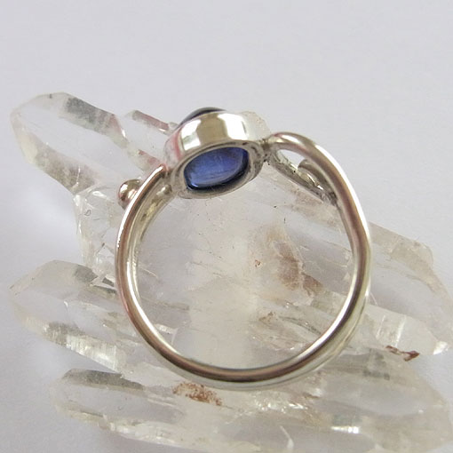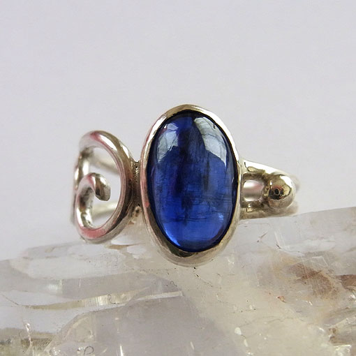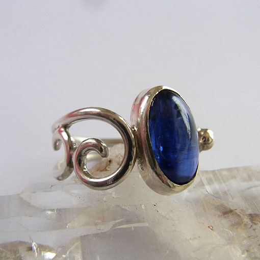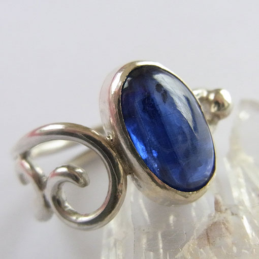 美しい高品質のカヤナイト(カイヤナイト)を片方だけ唐草のリングに仕上げました。 付ける方向によって、雰囲気が変わる個性的なデザインのリングです。 カヤナイトの和名は藍晶石といい、板状の結晶で産出されます。 色にムラがあることが多く、このような濃いブルーで色が均一なものは少ないようです。