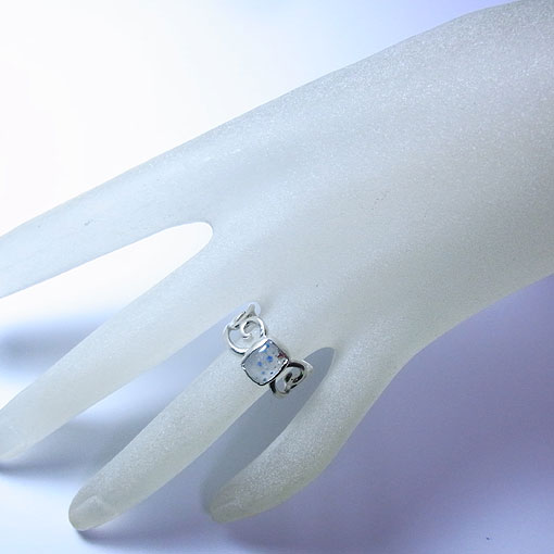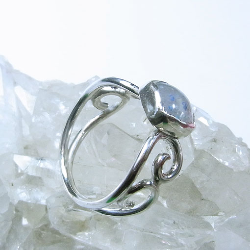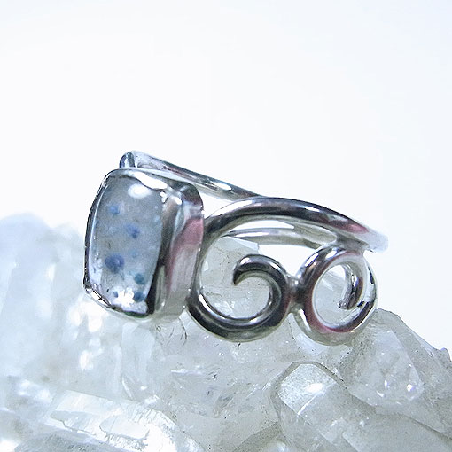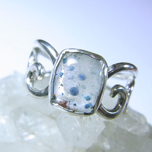 アイスブルーのコロンとした可愛いジラライト(銅の珪酸塩鉱物)を内包した水晶を 唐草デザインの可愛らしいリングに仕上げました。 ブラジルのパライバ州で産出することから パライバクォーツとも呼ばれます。 少し赤い部分(おそらく鉄分)が入り込んでいますが、 ジラライトがバランスよく内包されたルースです。