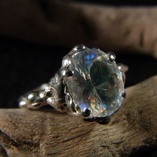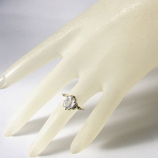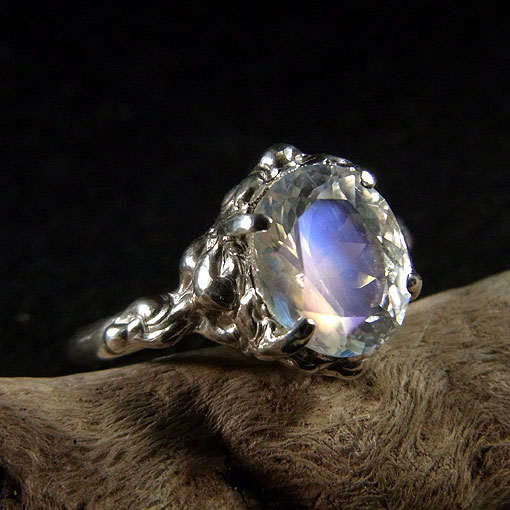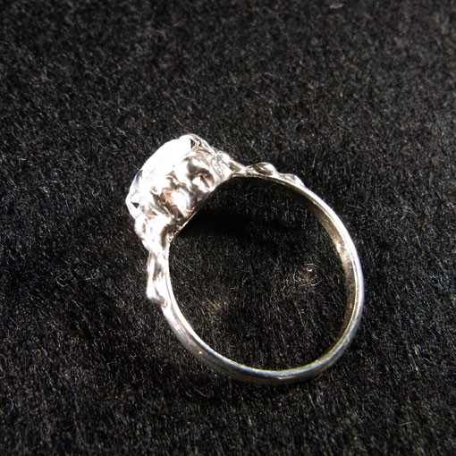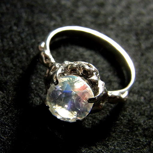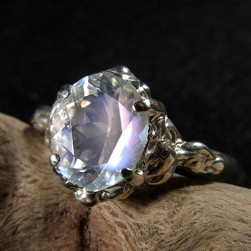 レインボーアンデシンのリング パープルピンクの光が浮かぶレインボーアンデシンを有機的なテクスチャのリングに仕上げました。 レインボーアンデシンは灰長石(アノーサイト)と曹長石(アルバイト)の中間に位置する鉱物で 角度によって色合いが変化して見え、強い光の下では鮮やかな輝きを浮かべます。 内包物の多い石のため、こちらもインクルージョンが見られますが、 室内の光では地味目の印象の石です。 |