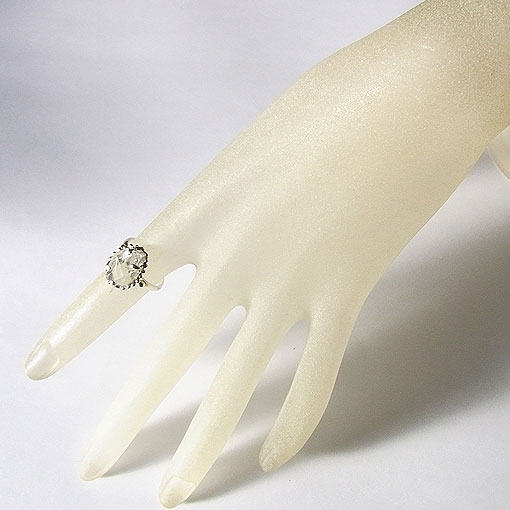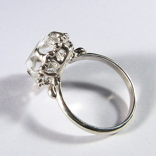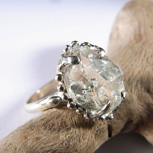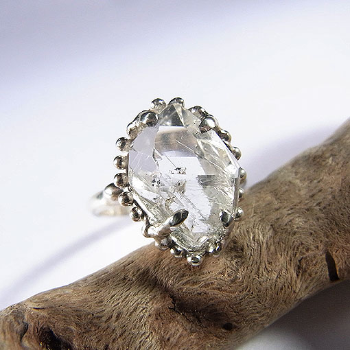 硬質な輝きが美しいアメリカ ニューヨーク州ハーキマーで産出する希少な 両剣水晶を、石の縁に粒飾りをあしらった愛らしい雰囲気のリングに仕上げました。