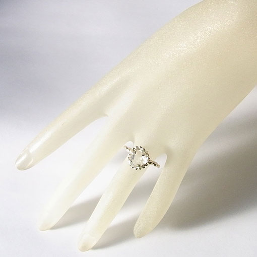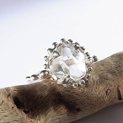 硬質な輝きが美しいアメリカ ニューヨーク州ハーキマーで産出する希少な 両剣水晶を、石の縁に粒飾りをあしらった愛らしい雰囲気のリングに仕上げました。
