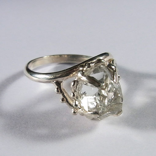 硬質な輝きが美しいアメリカ ニューヨーク州ハーキマーで産出する希少な 両剣水晶を、片唐草のアシンメトリーなリングに仕上げました。