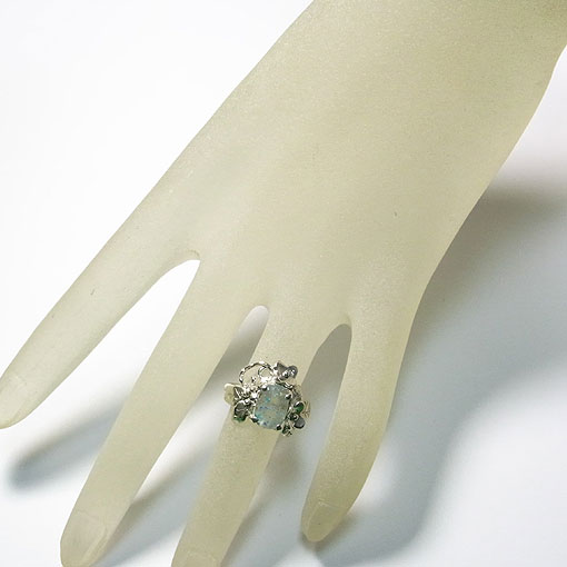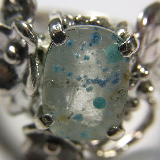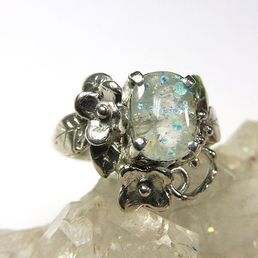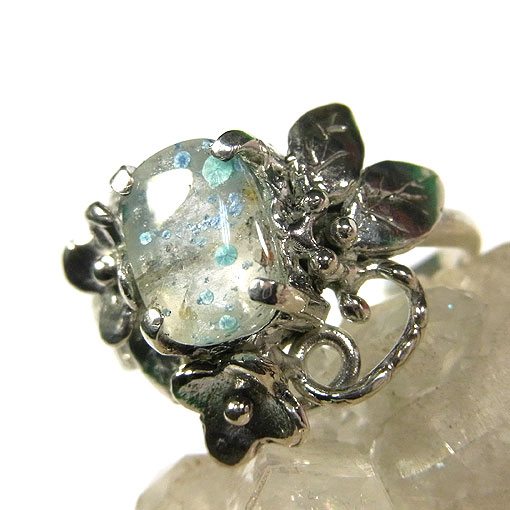 アイスブルーのコロンとした可愛いジラライト(銅の珪酸塩鉱物)を内包した水晶を 小花飾りをあしらった可愛らしいリングに仕上げました。 ブラジルのパライバ州で産出することから パライバクォーツとも呼ばれます。