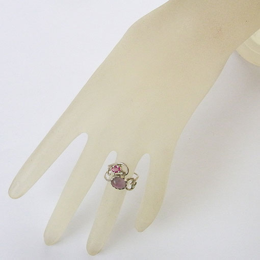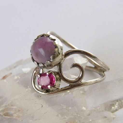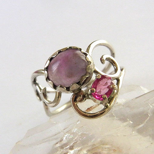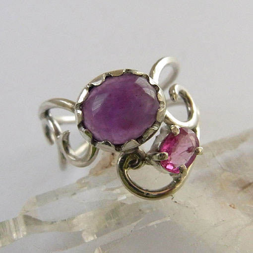 ハックマナイトとピンクサファイアの唐草リング 淡い紫のハックマナイトと小さなピンクサファイアを唐草デザインの個性的なリングに仕上げました。 こちらで紫外線照射前の画像ですが、自然光に少しあたっていますので、 ルビーとして販売されていたものですが、色合いがピンクに近いので *ルビーとサファイアはコランダムという同じ鉱物です。 |