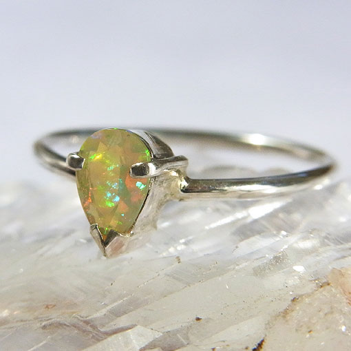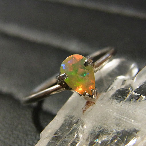 ここ数年で、かなり市場に出回るようになったエチオピア産のオパールです。 遊色が強く浮かび、ハイドロフェンタイプと呼ばれる水に浸すと透明になるものが多く見られます。 こちらのリングはハイドロフェンではないと思われます・・・試してませんが(笑) お試しになる場合は、薬局などに売っている精製水をお使いくださいね。
