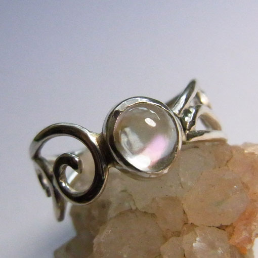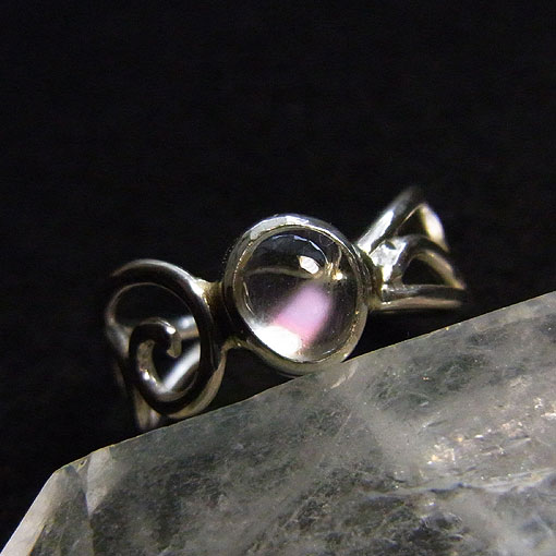 正面から見るとパープルピンクの光が浮かぶホワイトラブラドライトを *ラブラドライト* 斜長石の一種で光の干渉により七色の光が見られる美しい鉱物です。 正面から見ると紫がかったピンク色に輝きますが、角度を変えてみますと 真横から見ると、虹色の輝きも見られますよ♪ |