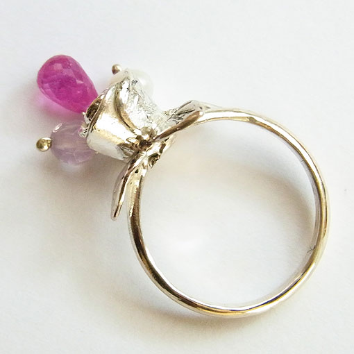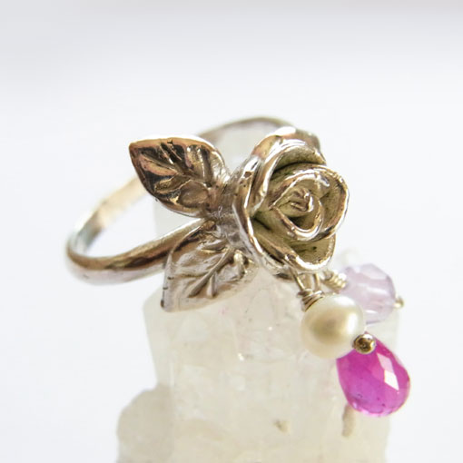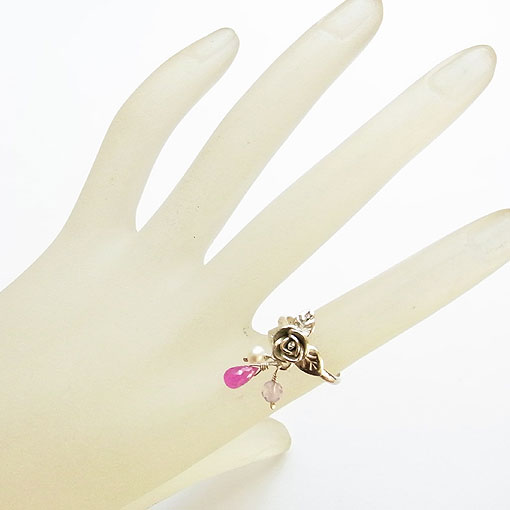 立体的なバラ飾りに天然石ビーズを飾り付けたリングです。 高さがあるので、お取り扱いにご注意ください。