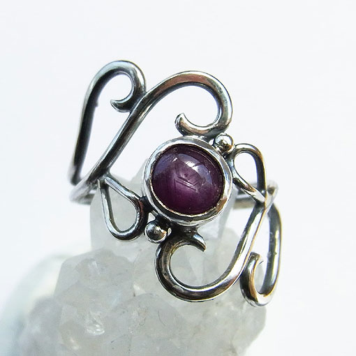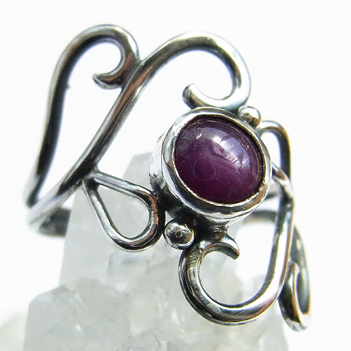 6条のスターが浮かび上がる小豆色のインドスタールビーを ラインが個性的なリングに仕上げました。