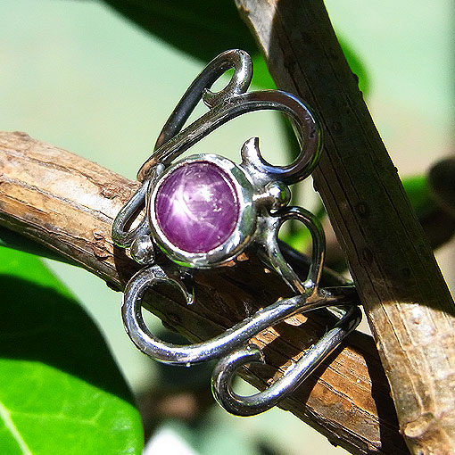 *インドスタールビー* インクルージョンの影響で光を当てると6条のスターが浮かび上がる石。 色合い的にはルビーではなく、バイオレットサファイアと呼んだほうがいいでしょうか。 *商品名は流通名で載せてみました。 室内の明かりでは見えにくいですが、直射日光に当てるとハッキリしたスターが見られますよ。