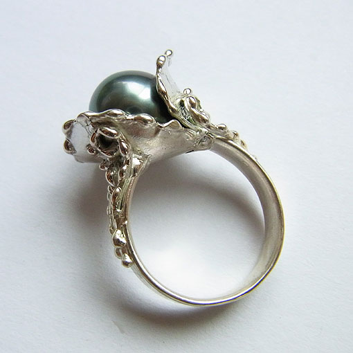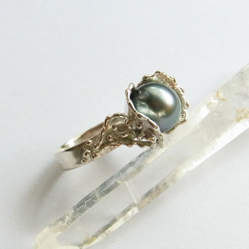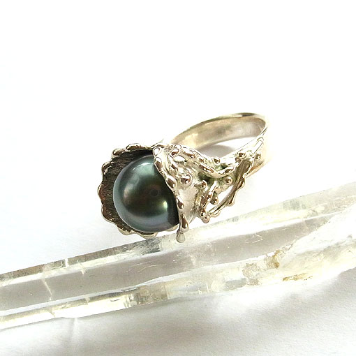 植物をイメージしたデザインに南洋黒蝶真珠を飾り付けた個性的なリングです。