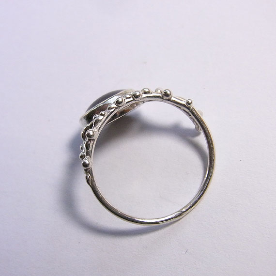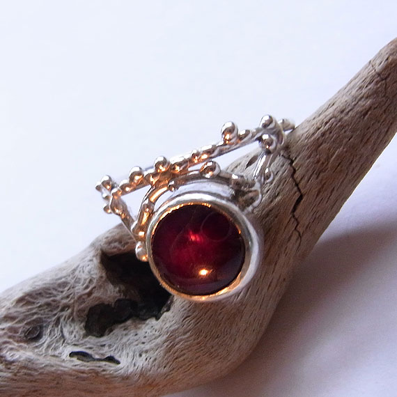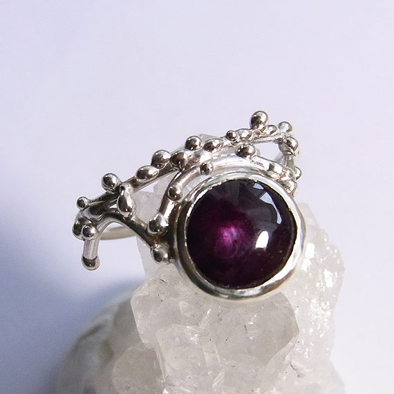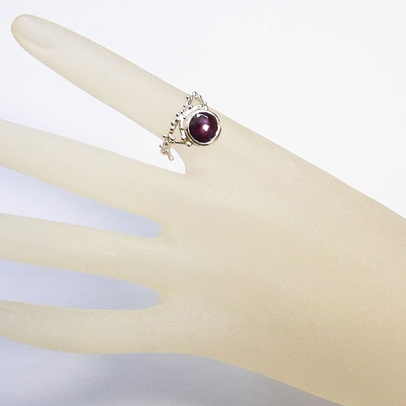 濃いワインレッドのスタールビーを植物の枝に滴が付いたような粒飾りのリングに仕上げました。