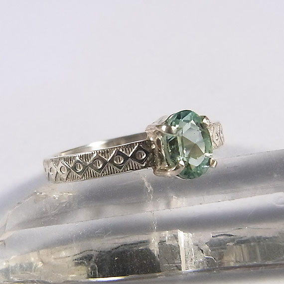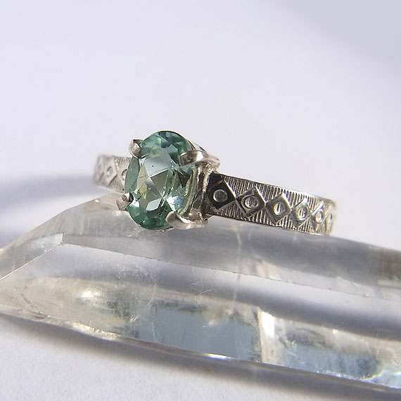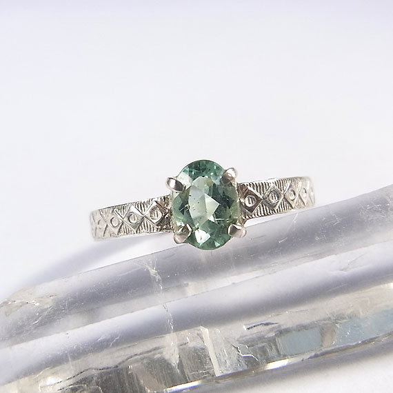 ![]() ミントグリーントルマリンのリング 爽やかな色合いのミントグリーントルマリンをカチッとしたデザインのシンプルなリングに仕上げました。 小粒で明るい色合いのトルマリンです。