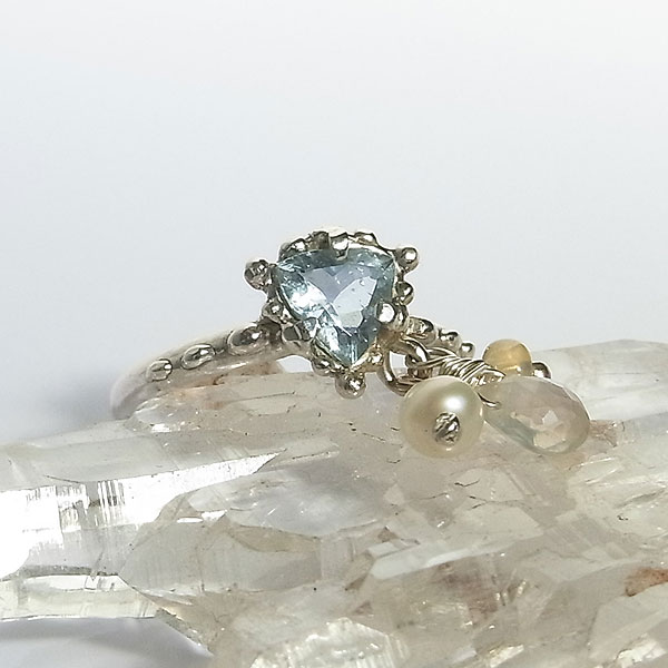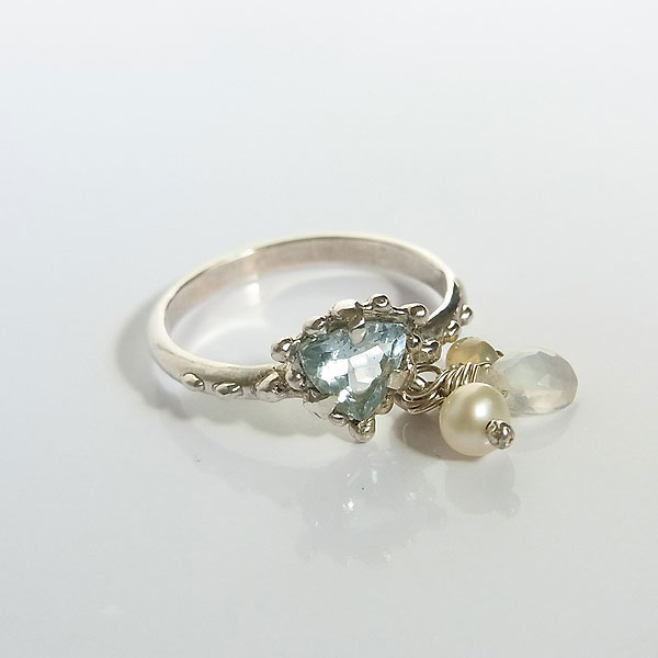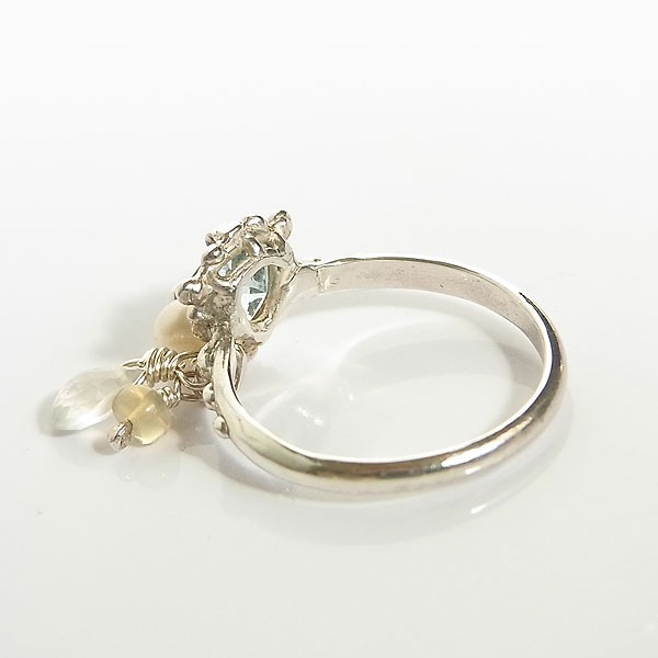 ![]() アクアマリンと天然石ビーズのリング 淡い水色の美しいアクアマリンを粒飾りのリングに留め、淡水パール、オパール、セイロンムーンストーンを アクアマリンは輝きがよく綺麗ですが、少しインクルージョンが見られますので予めご了承ください。