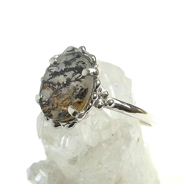 樹枝状の模様が綺麗に入り込んだデンドリッククォーツをシンプルなリングに仕上げました。 石枠の縁とアームのサイドに粒飾りをあしらっていますので、キラキラと輝きます♪