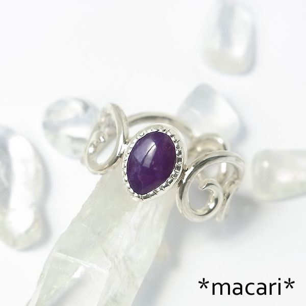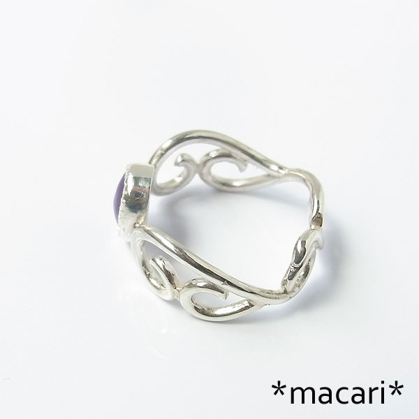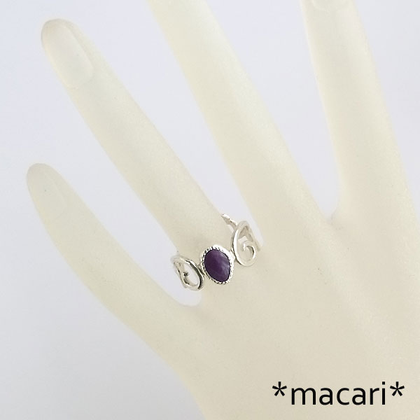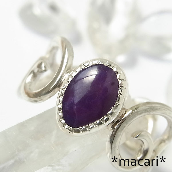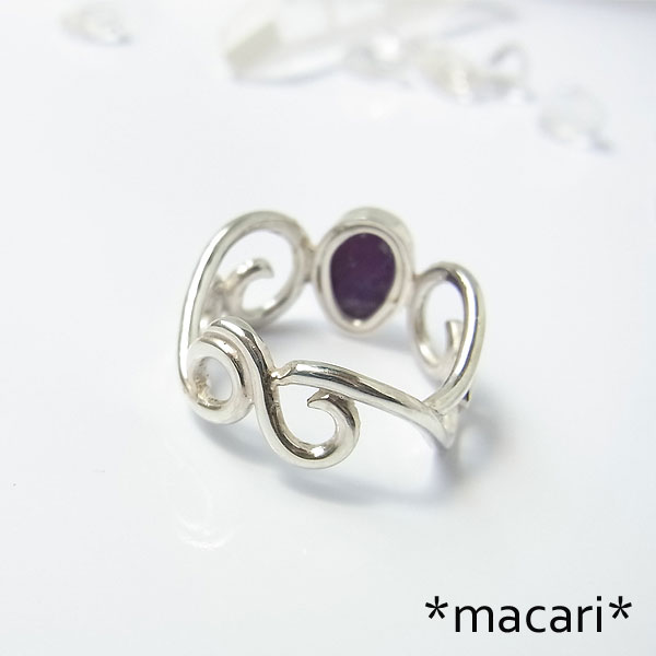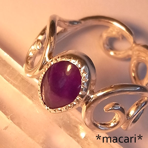 ![]() スギライトのリング 小粒ですが濃い紫色の上質なスギライトをアシンメトリーな唐草デザインのリングに仕上げました。 画像だと少し黒っぽく見えますが、肉眼で見ると鮮やかな濃い紫色の石です。 少し白い線状の模様が見られます。
