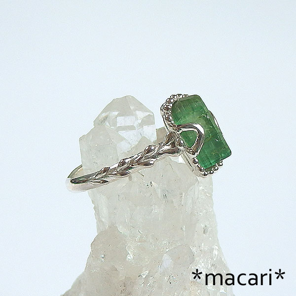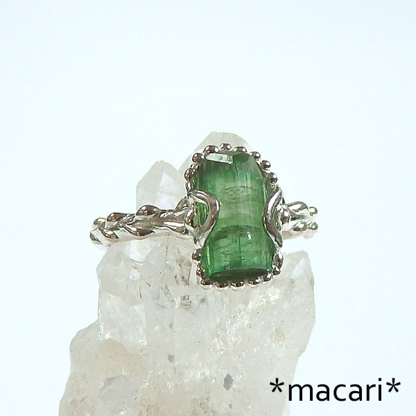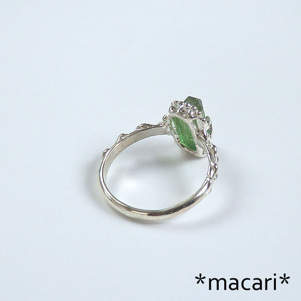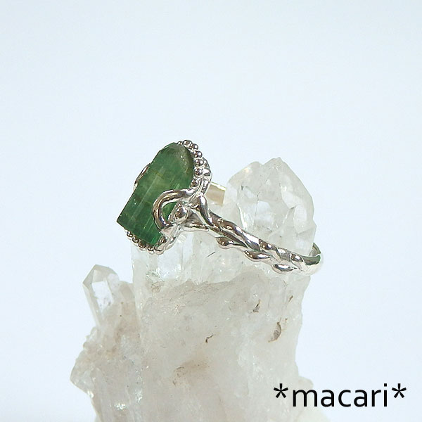 グリーントルマリン原石の粒飾りリング 発色の美しいアフガニスタン産のグリーントルマリンの結晶を 小ぶりな結晶なので、とっても可愛いですよ。^^ *トルマリン* 和名は電気石といい、熱したり圧力を加えたりすると帯電する性質があります。 様々な色合いのある石で、グリーンは一番ポピュラーなカラー。 こちらは結晶の形が整った美しいトルマリンを使用してみました。 |