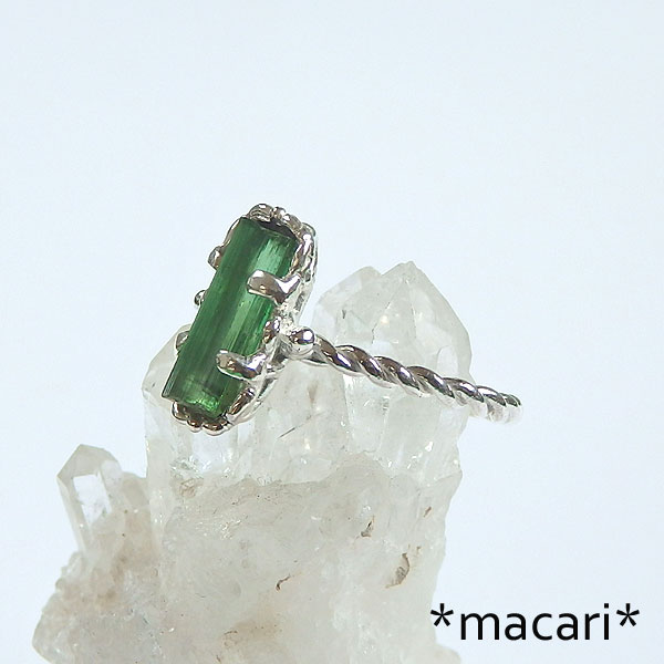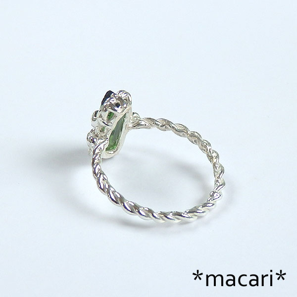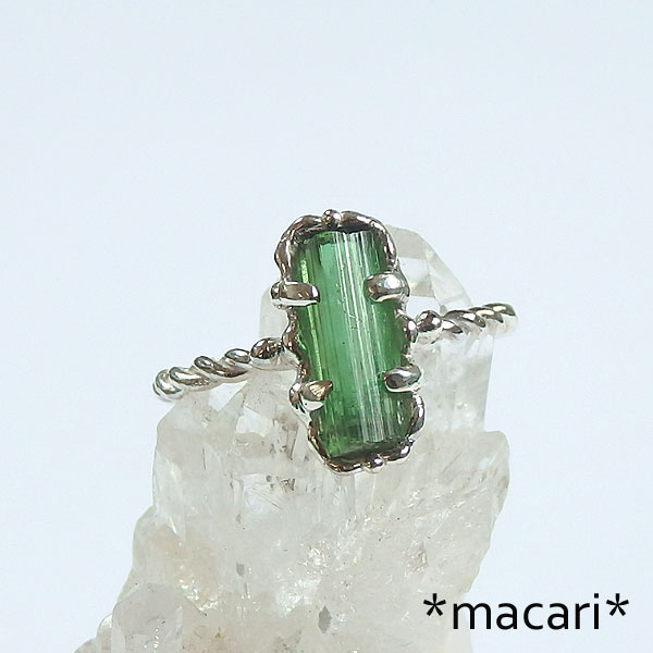 グリーントルマリン原石のツイストリング 発色の美しいアフガニスタン産のグリーントルマリンの結晶を 小ぶりな結晶なので、とっても華奢で可愛いですよ。^^ *トルマリン* 和名は電気石といい、熱したり圧力を加えたりすると帯電する性質があります。 様々な色合いのある石で、グリーンは一番ポピュラーなカラー。 こちらは結晶の形が整った美しいトルマリンを使用してみました。 |
