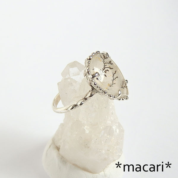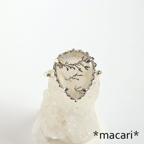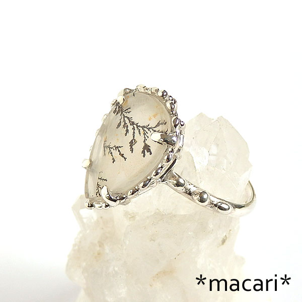 クォーツの中にマンガンがしみ込み再結晶化することによって、このような美しい樹枝状の模様を成します。 模様の出方によっては高価な代物ですが、こちらは小型のルースの為 比較的お求めやすい価格で制作しています。 個人的には、もうちょっと透明感があるものが好きですが、このようなフンワリした地色も 優しげで落ち着いた雰囲気が素敵ですよ。 ^^