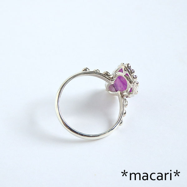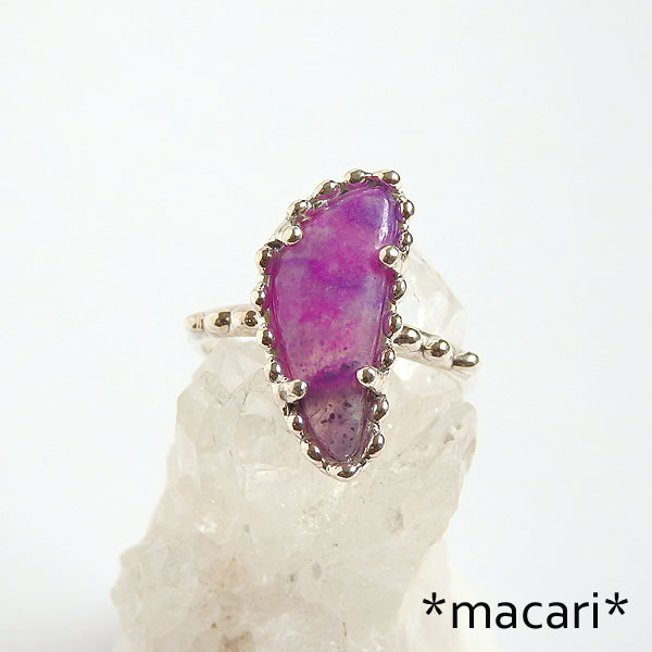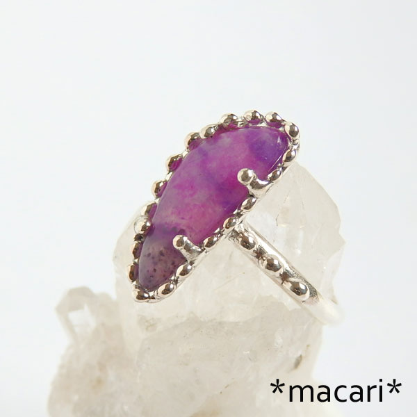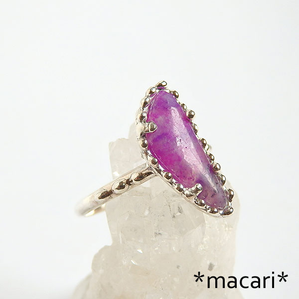 スギライトの粒飾りリング 不定形のスギライトのルースを石枠の縁に粒飾りをあしらったリングに仕上げました。 色合いはピンクスギライトと呼んでも良いくらい明るい色合いですが、画像は少し赤みが強く出ています。 *スギライト* 唯一日本人の名前がついている鉱物です。 含まれる成分によって色合いが異なり、リヒタライトなどが入ると青みが強くなります。 |